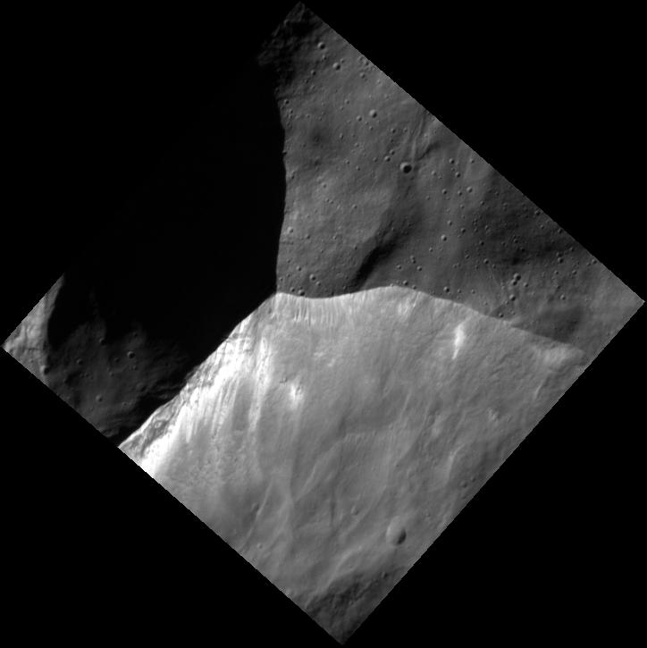This high-resolution image shows the intersection of two crater rims. The full craters can be seen in this context image -- the high-resolution image covers the rim intersection very close to the context image center. Downslope movement of material in the crater wall has exposed fresh, brighter soil.