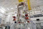 Engineers and technicians use a crane to lift the main body of NASA's Europa Clipper spacecraft and position it in the High Bay 1 clean room of the Spacecraft Assembly Facility at the agency's Jet Propulsion Laboratory in Southern California. Standing 10 feet (3 meters) high and 5 feet (1.5 meters) wide, the core will be the focus of attention as the spacecraft is assembled for its launch to Jupiter's moon Europa in October 2024.