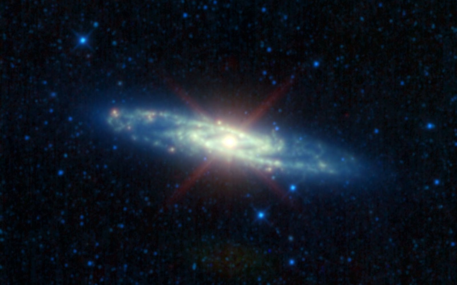 The Sculptor galaxy, or NGC 253, is seen in a rainbow of infrared colors in this mosaic by NASA's Wide-field Infrared Survey Explorer. The Sculptor galaxy can be seen by observers in the southern hemisphere with a pair of good binoculars.