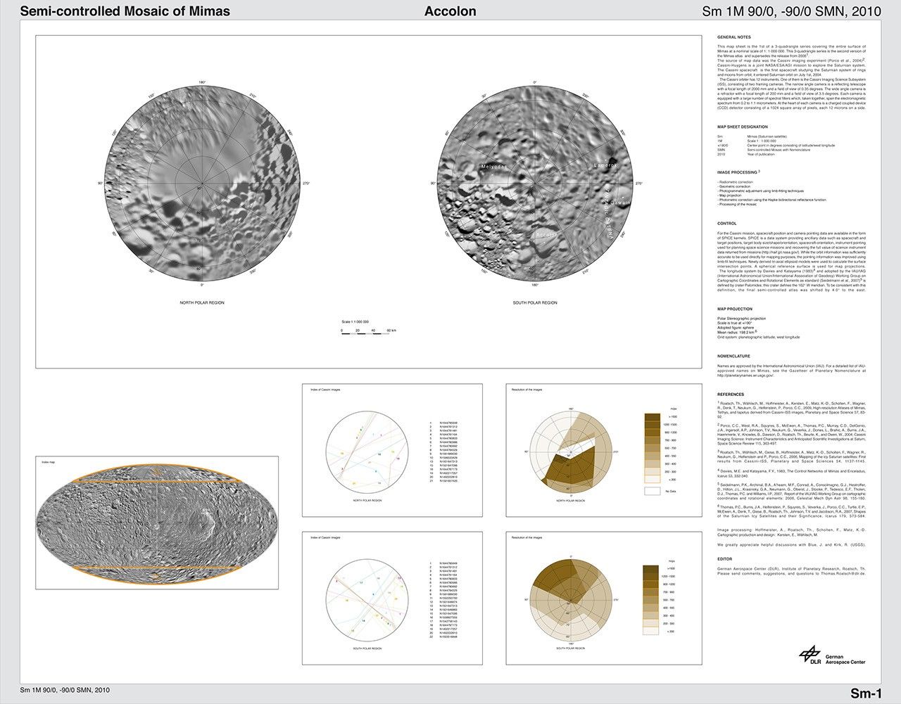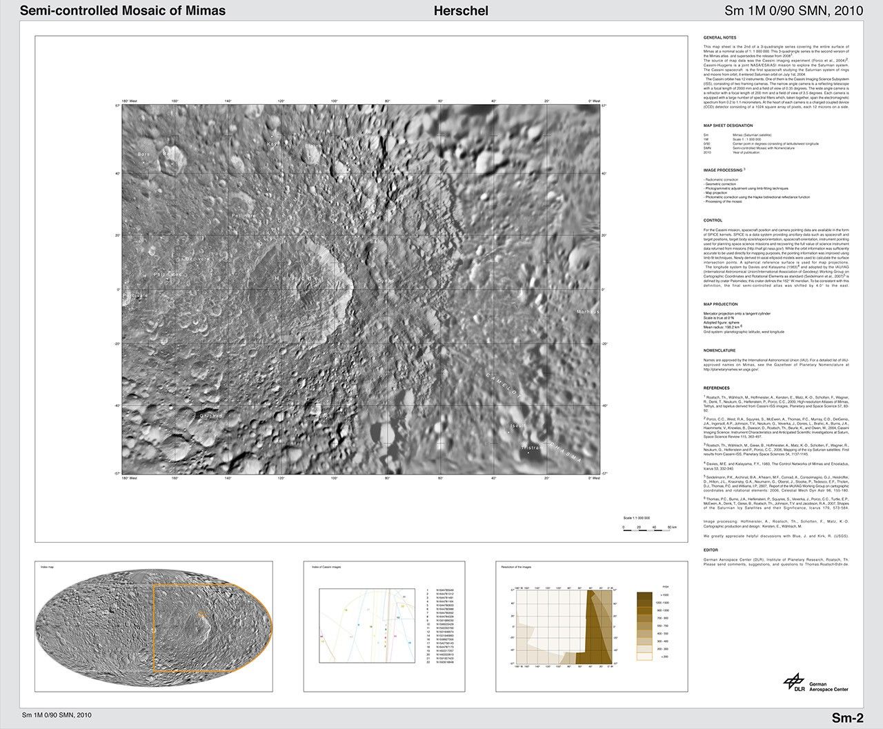 The map sheets form a three-quadrangle series covering the entire surface of Mimas at a nominal scale of 1:1,500,000. The map data were acquired by the Cassini imaging cameras. The mean radius of Mimas used for projection of the maps is 198.2 kilometers (123.2 miles). Image scale is 216.2 meters (709 feet) per pixel. The resolution of the map is 16 pixels per degree.