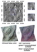 The lower right image reveals the strengths of mineral spectral features overlain on a black-and-white version of the infrared image. Areas shaded in red hold more of the mineral pyroxene, a primary component of basaltic rocks that are prevalent in the highlands. Spots of green indicate monohydrated sulfate minerals (sulfates with one water molecule incorporated into each molecule of the mineral), while blue indicates polyhydrated sulfate minerals (sulfates with multiple waters per mineral molecule).