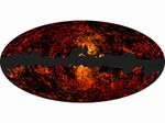This all-sky image shows the spatial distribution over the whole sky of the galactic haze at 30 and 44 GHz, extracted from the Planck observations. In addition to this component, other foreground components such as charged particles accelerated radially, known as synchrotron radiation, thermal dust, spinning dust, and extragalactic point sources contribute to the total emission detected by Planck at these frequencies. The prominent empty band across the plane of the galaxy corresponds to the mask that has been used in the analysis of the data to exclude regions with strong foreground contamination due to the galaxy's diffuse emission. The mask also includes strong point-like sources located over the whole sky.