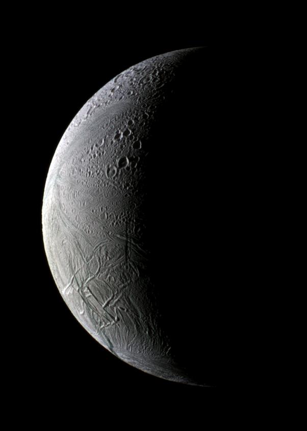 Sunrise uncovers both old and new Enceladus in this image from the Cassini spacecraft.