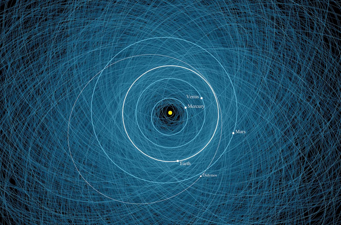 This diagram shows the orbit of binary asteroid Didymos around the Sun. Didymos consists of a large, nearly half-mile-wide (780-meter-wide) asteroid orbited by a smaller, 525-foot-wide (160-meter-wide) asteroid, or moonlet. Didymos' orbital path around the Sun is shown as the thin white ellipse and Earth's orbit is the thick white line. In the background are the orbits for 2,200 other known potentially hazardous asteroids.