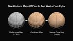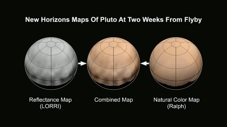 What color is Pluto? The answer, revealed in the first maps made from New Horizons data, turns out to be shades of reddish brown. The mission's first map of Pluto is in approximate true color -- that is, the color you would see if you were riding on New Horizons. At left, a map of Pluto's northern hemisphere composed using high-resolution black-and-white images from New Horizons LORRI instrument. At right is a map of Pluto's colors created using data from the Ralph instrument. In the center is the combined map, produced by merging the LORRI and Ralph data.