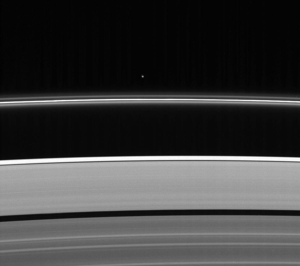 Less intrusive than her sibling shepherd moon, Pandora nonetheless provides a gravitational influence that helps confine and perturb the F ring's shape.