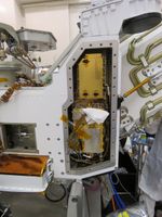 This image, taken in the clean room at NASA's Jet Propulsion Laboratory in Southern California, shows the Radar Imager for Mars' Subsurface Experiment (RIMFAX) electronic's box after it has been inserted into the Perseverance rover. The gold-plated electronics box is at the top of the opening. RIMFAX's antenna will be mounted on the bottom rear of the rover.