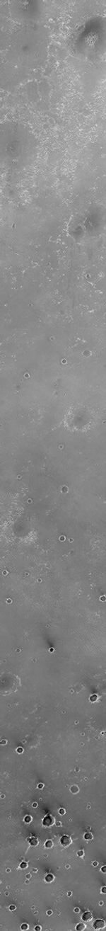 This Mars Global Surveyor (MGS) Mars Orbiter Camera (MOC) image shows a dark, relatively smooth plain in the central Terra Meridiani region of Mars. The larger circular features in the upper three-quarters of the image are thought to be the locations of buried craters formed by meteorite impact. The cluster of smaller circular features in the bottom quarter of the scene represent a field of craters formed either by simultaneous impact of many meteorites, or there-impact of material thrown from a much, much larger nearby crater as it formed. The dark material covering these plains includes an abundance of the iron oxide mineral, hematite, that was detected by the MGS Thermal Emission Spectrometer (TES). During late 1999, the "hematite region," as it came to be called, emerged along with the Libya Montes as one of the top two choices of landing sites for the now-canceled Mars Surveyor 2001 lander. This image, illuminated by sunlight from the left, covers an area 3 kilometers (1.9 miles) wide and 19 kilometers (11.8 miles) long. The scene is located near 2.2°S, 3.7°W and was acquired on August 19, 1999.