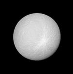 The Cassini spacecraft views Rhea and the bright, rayed crater that is likely one of the younger features on the moon's surface. The impact excavated fresh material from beneath the ground, which spread out in this pattern as it fell back to Rhea.