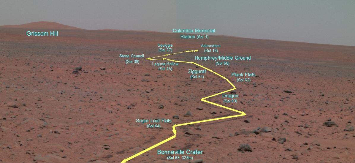 This false-color panoramic camera composite traverse map depicts the Mars Exploration Rover Spirit's journey since landing at Gusev Crater, Mars. It was generated from three of the camera's different wavelength filters (750 nanometers, 530 nanometers and 480 nanometers). This map was created on the 65th martian day, or sol, of Spirit's mission, after Spirit had traveled 328 meters (1076 feet) from its lander to the rim of the crater dubbed "Bonneville." From this high point, Spirit was able to capture with its panoramic camera the entire rover traverse. The map points out major stops that Spirit made along the way, including features nicknamed "Adirondack;" "Stone Council;" "Laguna Hollow;" and "Humphrey." Also highlighted is the landscape feature informally named "Grissom Hill" and Spirit's landing site, the Columbia Memorial Station.