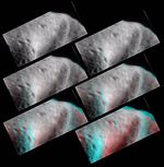 Several frames from a rotation movie NEAR Shoemaker took on September 19, 2000, from an orbit 100 kilometers (62 miles) above Eros, were combined to create these 3-D views of the saddle region. 3-D images made using the red and blue color technique are called anaglyphs and must be viewed through red-blue 3-D glasses.