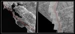 The left mosaic shows the portion of the San Andreas fault near California's san Francisco Bay that has been scaled to the same size and resolution as the Europa image. Each covers an area approximately 170 by 193 kilometers (105 by 120 miles). The red line marks the once active central crack of the Europan fault (right) and the line of the San Andreas fault (left).