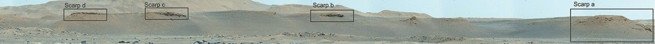 This mosaic featuring several of the escarpments, or scarps – long, steep slopes – of Jezero Crater's river delta was taken by the Mastcam-Z instrument aboard NASA's Perseverance rover on Apr. 17, 2021. The delta formed billions of years ago from sediment that an ancient river carried to the mouth of the lake that once existed in the crater. The images that stitched together to create the mosaic were taken from a distance of about 1.2 miles (2.2 kilometers).