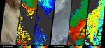The left panel of each of these two image sets (Red Sea, left; U.S. coastline, right) is a natural-color view from MISR's 70-degree forward viewing camera. The color-coded maps in the central panels show aerosol optical depth; the right panels provide a measure of aerosol size, expressed as the "Angstrom exponent." For the optical depth maps, yellow pixels indicate the most optically-thick aerosols, whereas the red, green and blue pixels represent progressively decreasing aerosol amounts. For this dramatic dust storm over the Red Sea, the aerosol is quite thick, and in some places, the dust over water is too optically thick for MISR to retrieve the aerosol amount. For the eastern seaboard haze, the thickest aerosols have accumulated over the Atlantic Ocean off the coasts of South Carolina and Georgia. Cases where no successful retrieval occurred, either due to extremely high aerosol optical thickness or to clouds, appear as dark gray pixels.