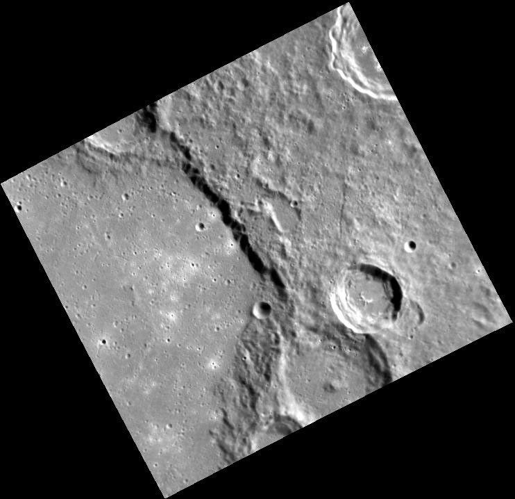 Along the left side of this image, we can see a portion of the interior of the Schubert impact basin. Located in Mercury's southern hemisphere, Schubert was named for the early 19th century composer Franz Schubert. The basin's smooth floor resulted when the basin filled with lava, further evidence of past volcanism on Mercury.