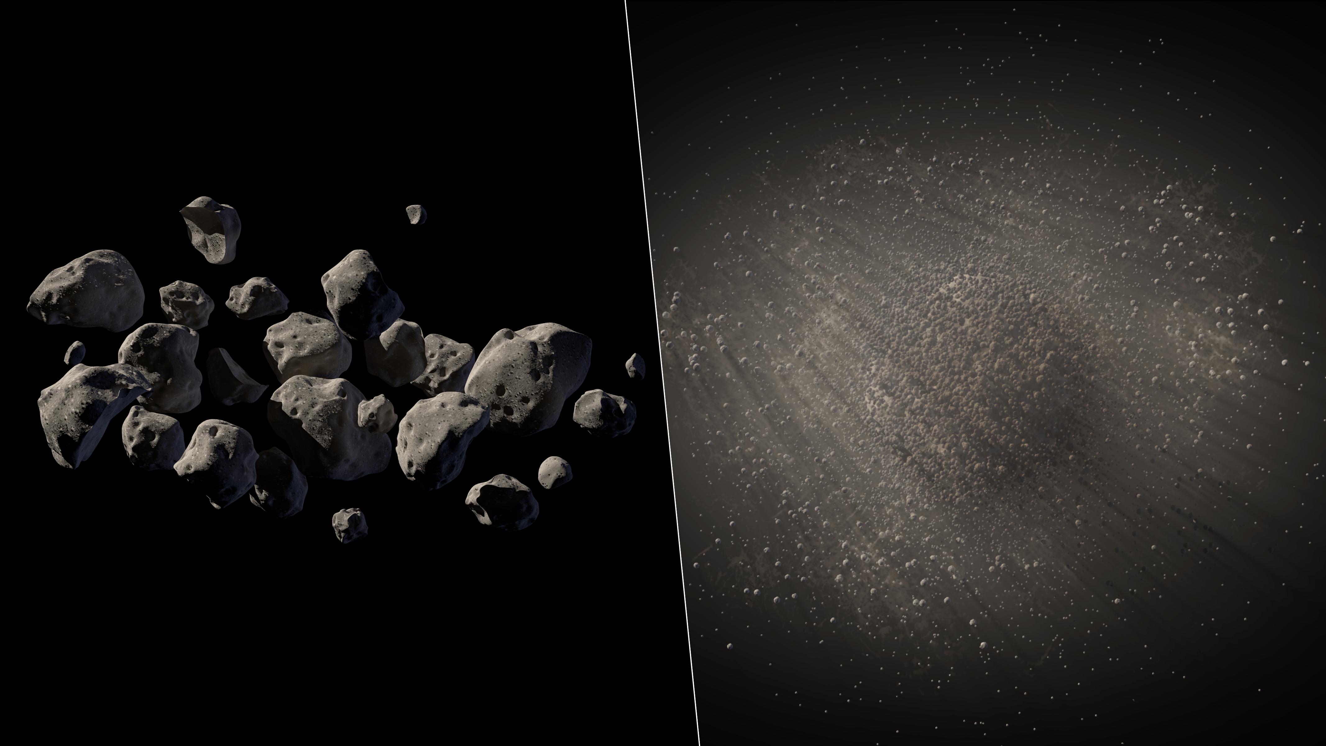 Observations from NASA's Spitzer Space Telescope reveal new information about the structure of 2011 MD, a small asteroid being considered by NASA for its proposed Asteroid Redirect Mission, or ARM. Spitzer's infrared images helped reveal that this asteroid consists of about two-thirds empty space. There are several possible structures for such an asteroid, two of which are illustrated here: a fleet of flying boulders (left) and a solid rock with a halo of fine debris (right).