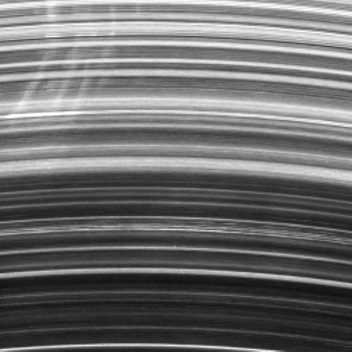 Also barely visible in this image are broader, much fainter but still bright radial regions that extend over larger radial distances than the spokes in the upper left. Where these fainter features cross ringlets in the lower part of the image, slight variations in brightness are apparent. These are probably due to tiny particles, possibly part of a former spoke, that haven't yet settled down onto the ring plane.