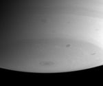 Saturn's southern polar region is haunted by a number of dark storms in this image, including one storm at right of center with a slight brightening around its boundary.