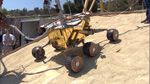 This image taken at NASA's Jet Propulsion Laboratory shows engineers rehearsing the sol 133 (June 8, 2004) drive into "Endurance" crater by NASA's Mars Exploration Rover Opportunity. Engineers and scientists have recreated the martian surface and slope the rover will encounter using a combination of bare and thinly sand-coated rocks, simulated martian "blueberries" and a platform tilted at a 25-degree angle. The results of this test convinced engineers that the rover was capable of driving up and down a straight slope before it attempted the actual drive on Mars.