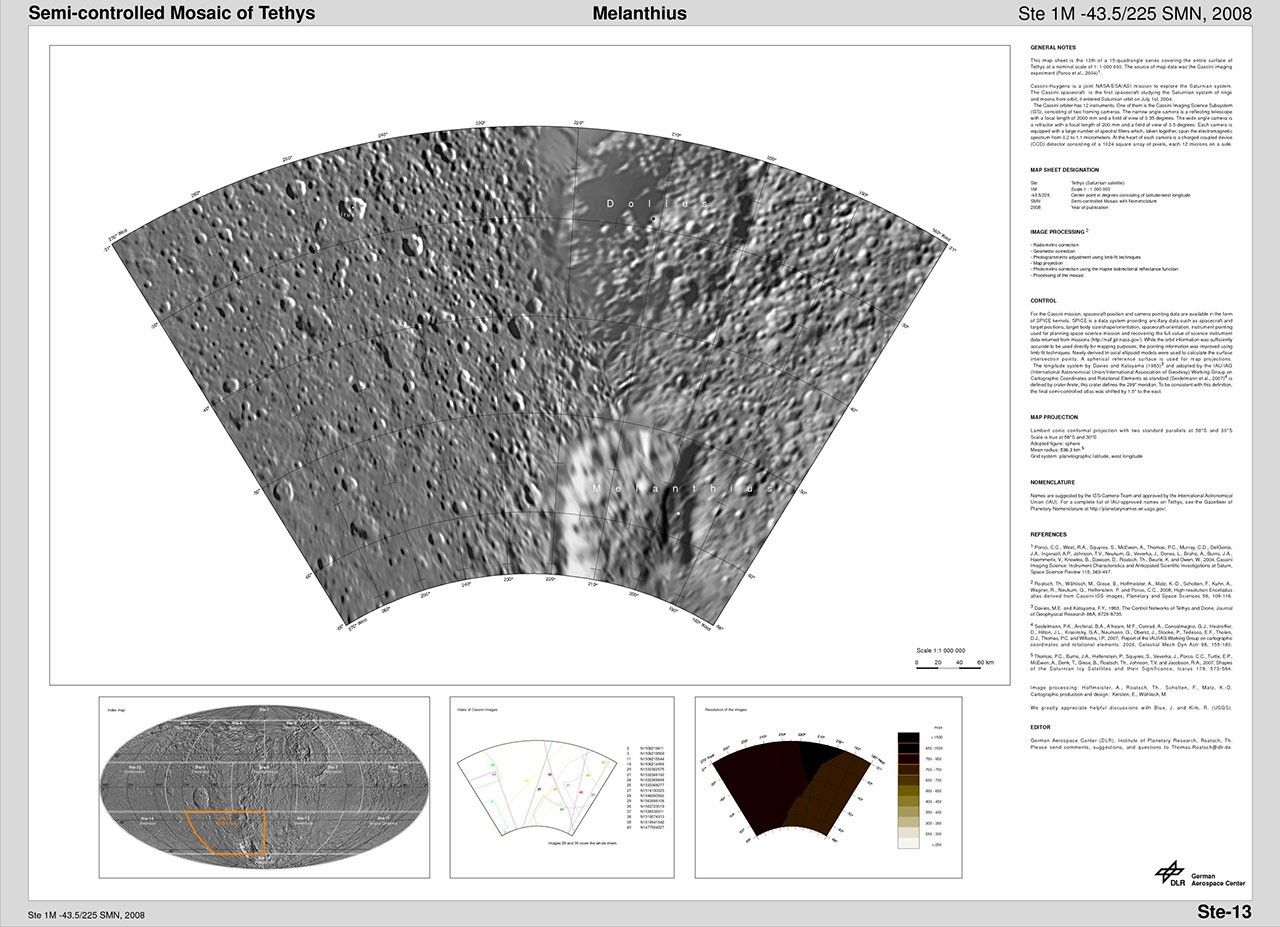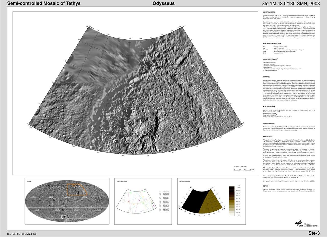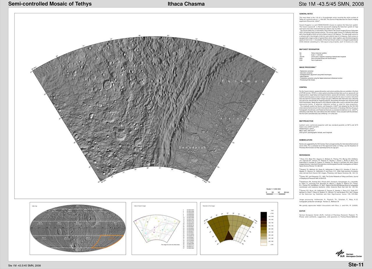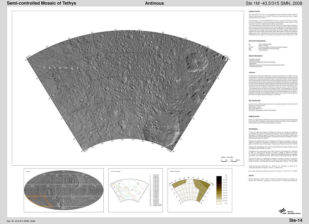 The map sheets form a 15-quadrangle series covering the entire surface of Tethys at a nominal scale of 1:1,000,000. An index for the atlas is included here, along with an unlabeled version of each terrain section. The map data was acquired by the Cassini imaging experiment. The mean radius of Tethys used for projection of the maps is 536.3 kilometers (333.2 miles). Names for features have been approved by the International Astronomical Union.