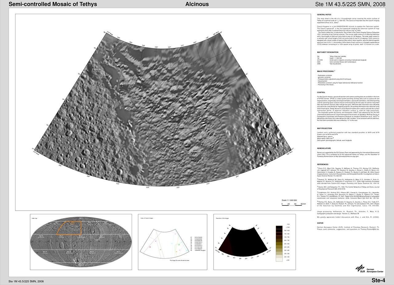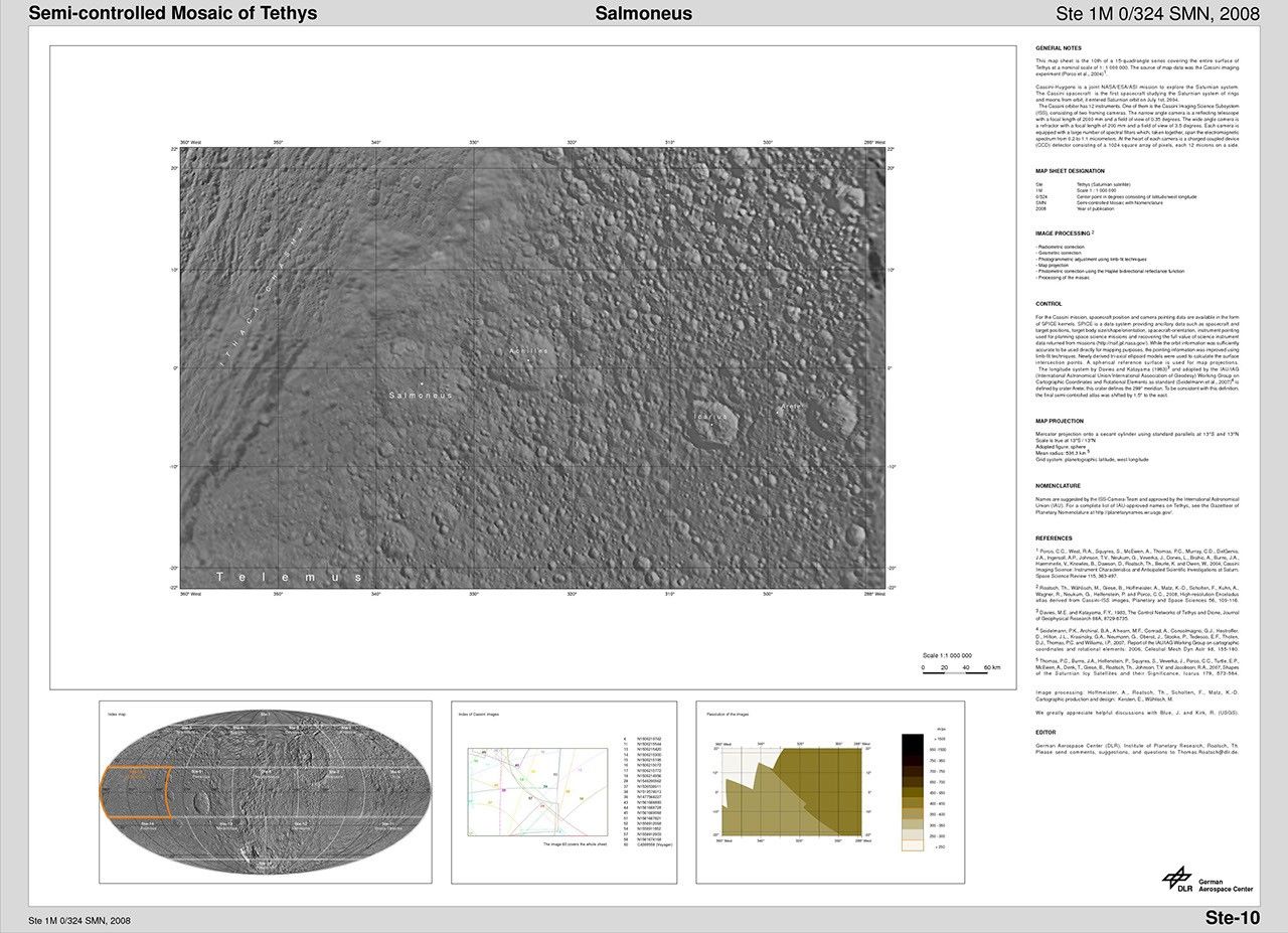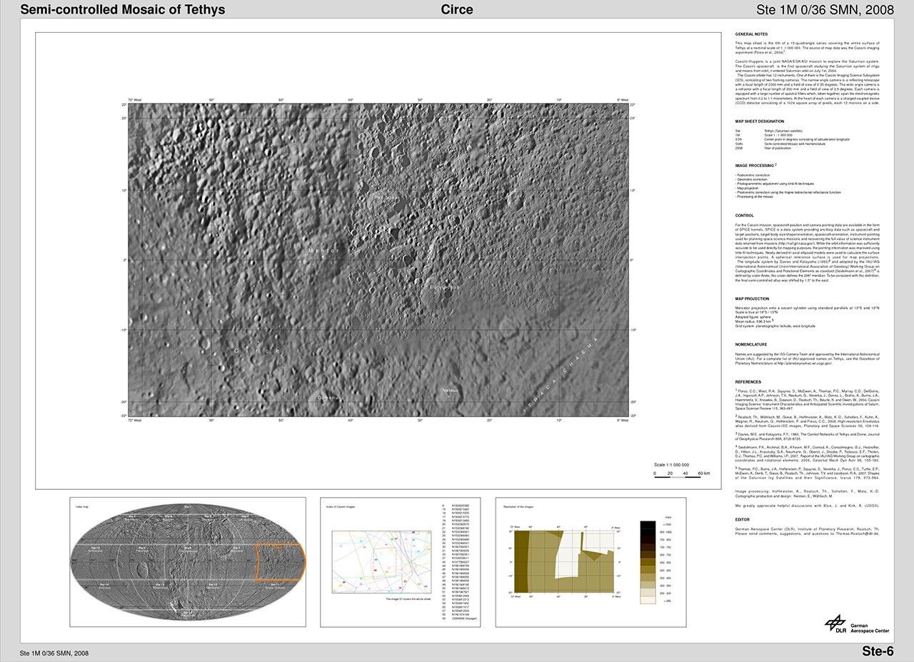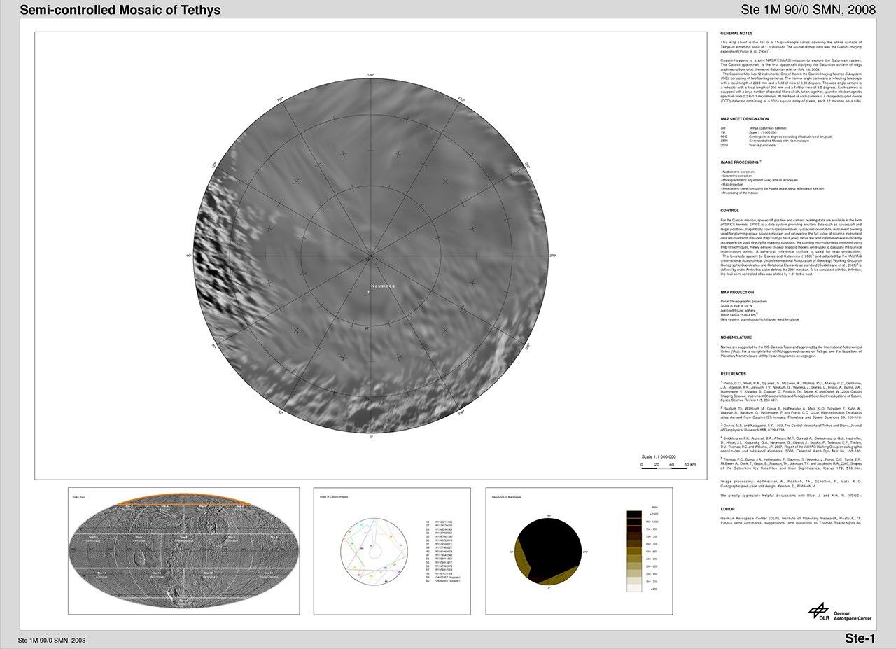 The map sheets form a 15-quadrangle series covering the entire surface of Tethys at a nominal scale of 1:1,000,000. An index for the atlas is included here, along with an unlabeled version of each terrain section. The map data was acquired by the Cassini imaging experiment. The mean radius of Tethys used for projection of the maps is 536.3 kilometers (333.2 miles). Names for features have been approved by the International Astronomical Union.