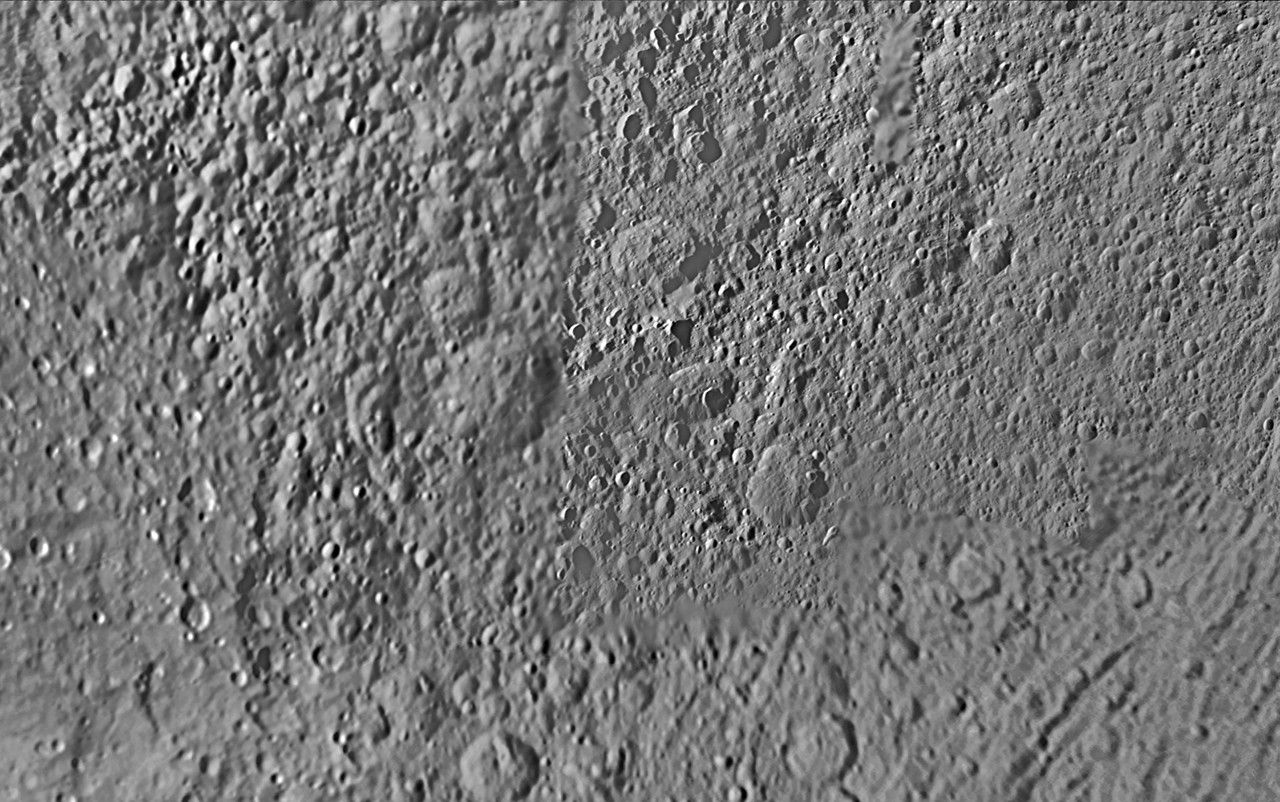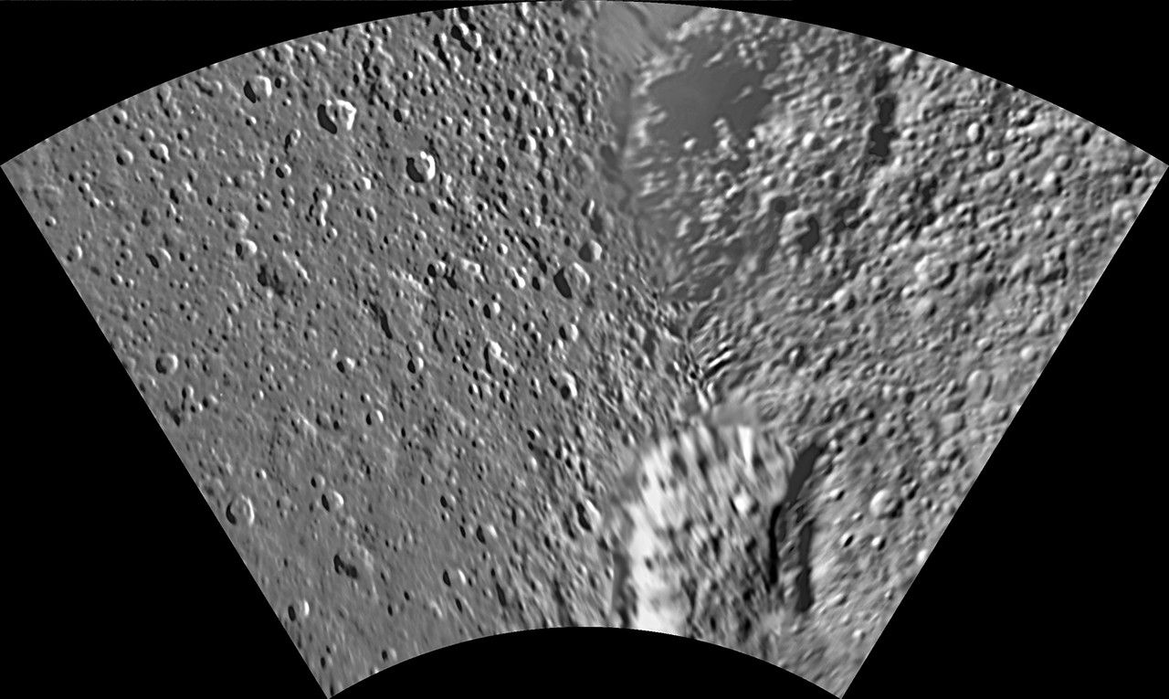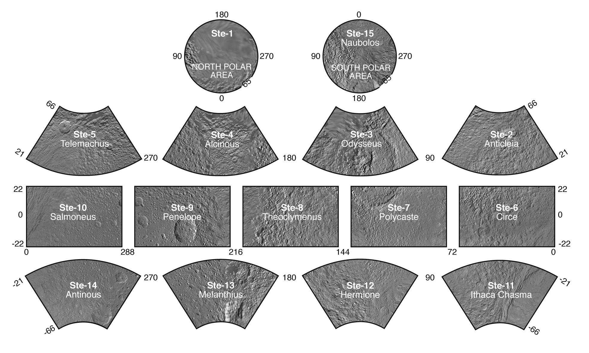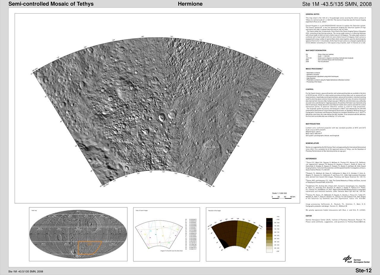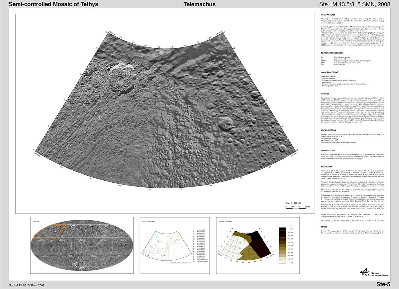 The map sheets form a 15-quadrangle series covering the entire surface of Tethys at a nominal scale of 1:1,000,000. An index for the atlas is included here, along with an unlabeled version of each terrain section. The map data was acquired by the Cassini imaging experiment. The mean radius of Tethys used for projection of the maps is 536.3 kilometers (333.2 miles). Names for features have been approved by the International Astronomical Union.