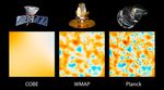 The three panels show 10-square-degree patches of all-sky maps created by space-based missions capable of detecting the cosmic microwave background. The first spacecraft, launched in 1989, is NASA's Cosmic Background Explorer, or COBE (left panel). Two of COBE's principal scientists earned the Nobel Prize in Physics in 2006 for the mission's evidence supporting the big bang theory, and for its demonstration that tiny variations in the ancient light reveal information about the state of the universe.