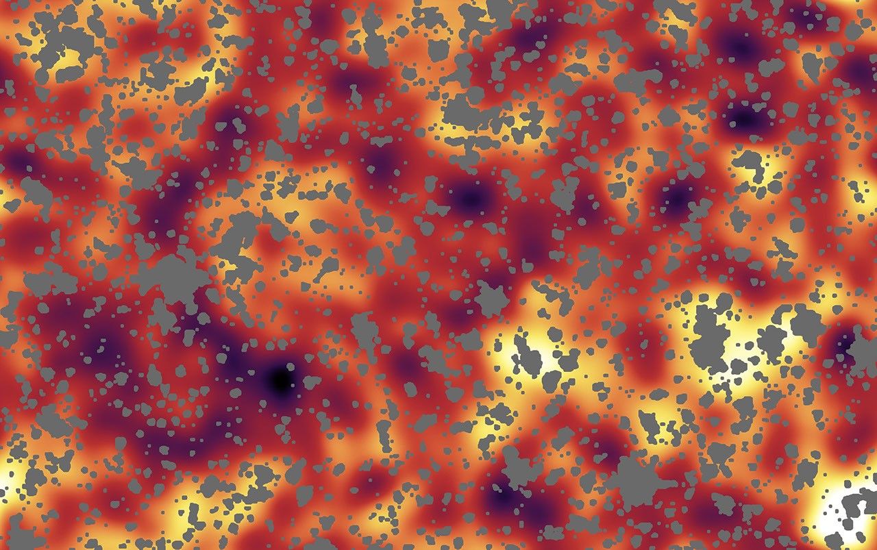 This is an image from NASA's Spitzer Space Telescope of stars and galaxies in the Ursa Major constellation. This infrared image covers a region of space so large that light would take up to 100 million years to travel across it. Figure 1 is the same image after stars, galaxies and other sources were masked out. The remaining background light is from a period of time when the universe was less than one billion years old, and most likely originated from the universe's very first groups of objects -- either huge stars or voracious black holes. Darker shades in the image on the left correspond to dimmer parts of the background glow, while yellow and white show the brightest light.