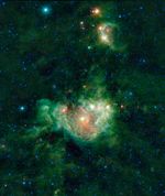 The colors in this image may look like brush strokes of paint but actually represent specific wavelengths of infrared light. Particles of interstellar dust are warmed by the star cluster in the center of the nebula, and glow in wavelengths of 12 and 22-microns, which WISE represents by the colors green and red. The blue and cyan (blue-green) stars scattered throughout the "canvas" of the image are hot compared to the dust, and emit light at 3.4 and 4.6 microns.