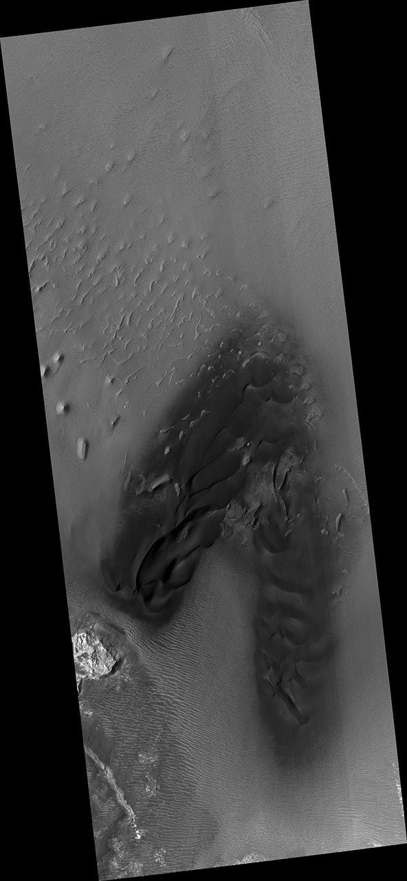 Migrating sand dunes often lead to the erosion and excavation of underlying material; regions where there are active dune fields are ideal places to search for exposed bedrock. Repeated imaging of dunes may also show changes that provide evidence for active surface processes related to wind patterns and climate.