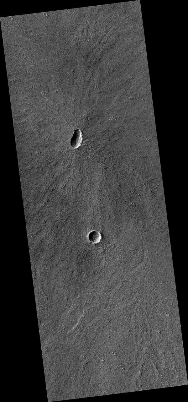 When looking at the scene for the first time, the image seems motion blurred. However, upon a closer look, the smaller, young craters are pristine, so the image must be sharp and the "blurriness" is due to the processes acting on the terrain. This suggests that the deflation-produced grooves, along with the crater and the caldera, are old features and deflation is not very active today. Alternatively, perhaps these craters are simply too young to show signs of degradation.
