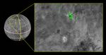 This composite image is based on observations from the New Horizons Ralph/LEISA instrument made at 10:25 UT (6:25 a.m. EDT) on July 14, 2015, when New Horizons was 50,000 miles (81,000 kilometers) from Charon. The spatial resolution is 3 miles (5 kilometers) per pixel. The LEISA data were downlinked Oct. 1-4, 2015, and processed into a map of Charon's 2.2 micron ammonia-ice absorption band. Long Range Reconnaissance Imager (LORRI) panchromatic images used as the background in this composite were taken about 8:33 UT (4:33 a.m. EDT) July 14 at a resolution of 0.6 miles (0.9 kilometers) per pixel and downlinked Oct. 5-6. The ammonia absorption map from LEISA is shown in green on the LORRI image. The region covered by the yellow box is 174 miles across (280 kilometers).