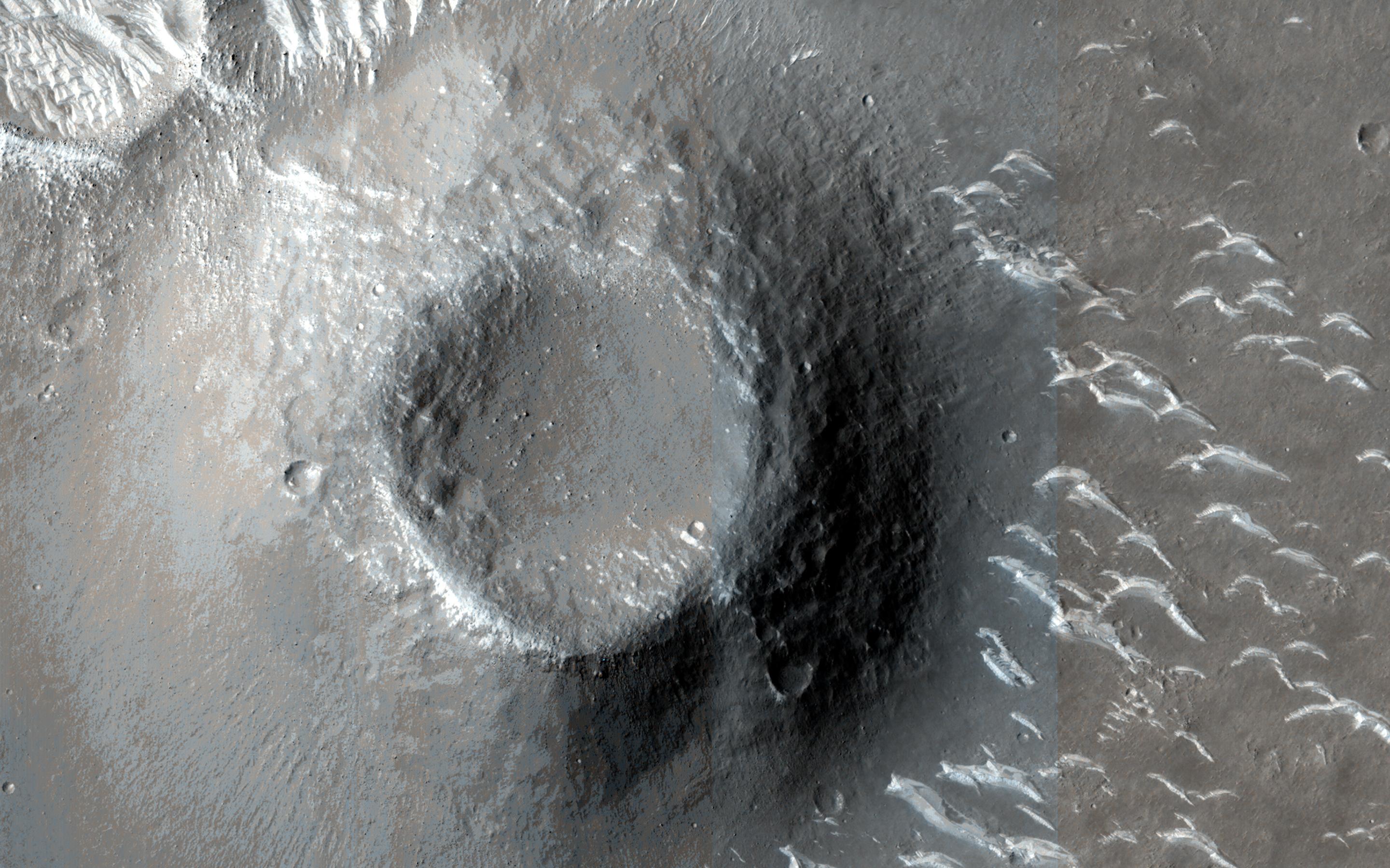 The expansive, flat, smooth plains of Utopia are dimpled by impact craters, volcanic domes, light-toned ridges made of wind-blown materials, and troughs. If the rover continues to drive south from its landing site, this HiRISE view shows the kind of terrain and features Zhurong may explore.
