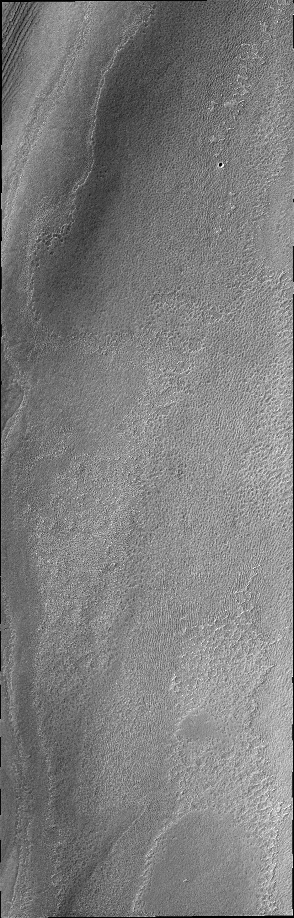 The south polar ice develops many different surface textures during the summer time. This texture is reminiscent of a sponge.