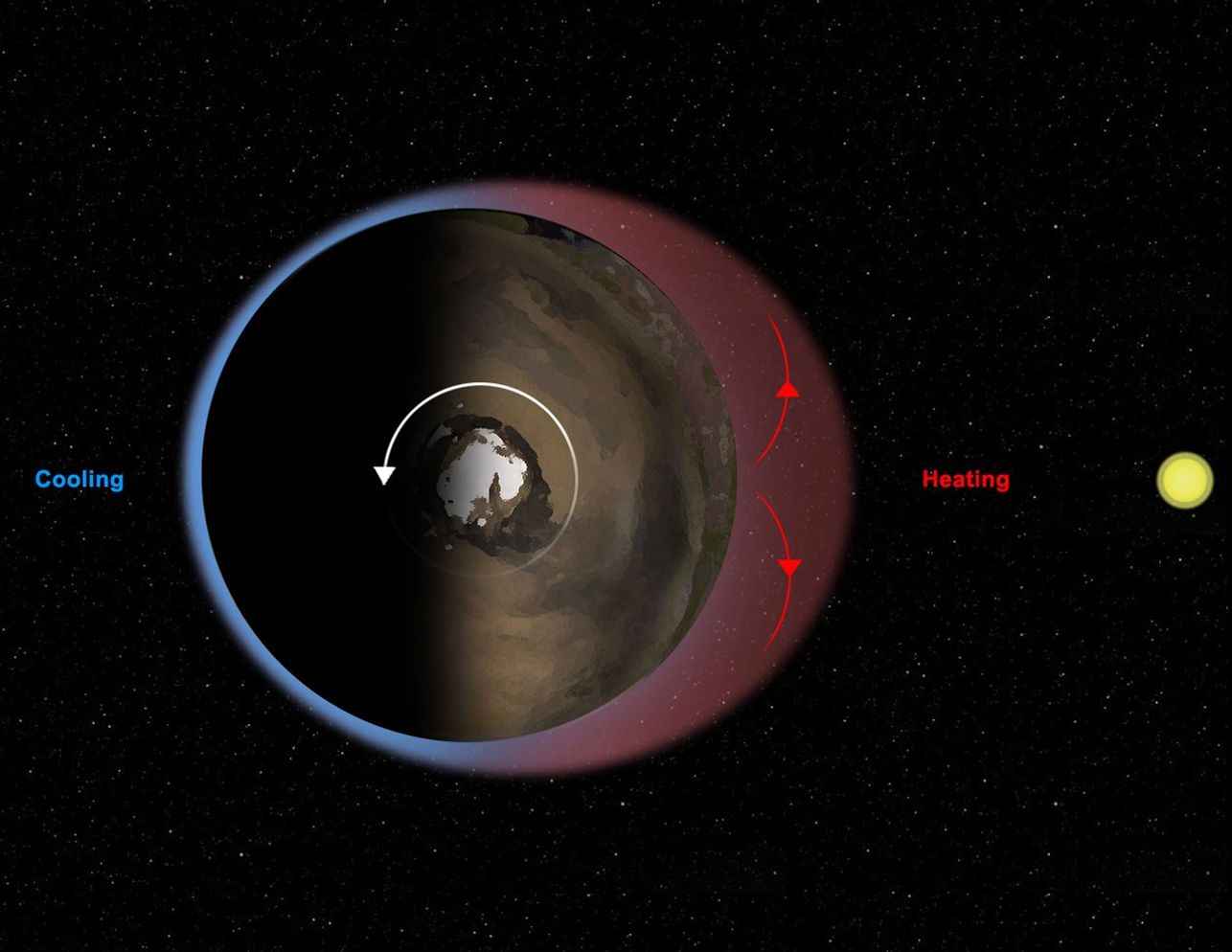 This diagram illustrates Mars' "thermal tides," a weather phenomenon responsible for large, daily variations in pressure at the Martian surface. Sunlight heats the surface and atmosphere on the day side of the planet, causing air to expand upwards. At higher levels in the atmosphere, this bulge of air then expands outward, to the sides, in order to equalize the pressure around it, as shown by the red arrows. Air flows out of the bulge, lowering the pressure of air felt at the surface below the bulge. The result is a deeper atmosphere, but one that is less dense and has a lower pressure at the surface, than that on the night side of the planet. As Mars rotates beneath the sun, this bulge moves across the planet each day, from east to west. A fixed observer, such as NASA's Curiosity rover, measures a decrease in pressure during the day, followed by an increase in pressure at night. The precise timing of the increase and decrease are affected by the time it takes the atmosphere to respond to the sunlight, as well as a number of other factors including the shape of the planet's surface and the amount of dust in the atmosphere.