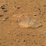 This approximate true color image taken by the panoramic camera onboard the Mars Exploration Rover Spirit shows "Adirondack," the rover's first target rock. Spirit traversed the sandy martian terrain at Gusev Crater to arrive in front of the football-sized rock on Sunday, Jan. 18, 2004, just three days after it successfully rolled off the lander. The rock was selected as Spirit's first target because its dust-free, flat surface is ideally suited for grinding. Clean surfaces also are better for examining a rock's top coating. Scientists named the angular rock after the Adirondack mountain range in New York. The word Adirondack is Native American and means "They of the great rocks."