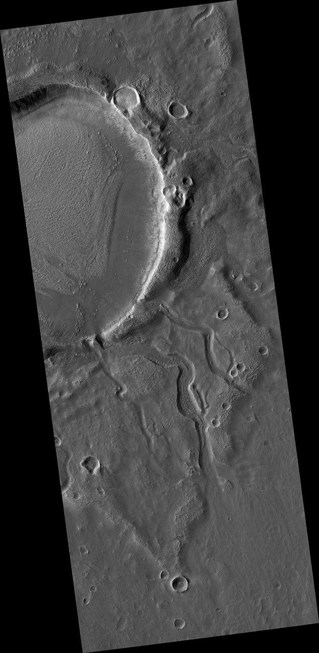 This image from NASA's Mars Reconnaissance Orbiter shows a roundish crater with three channels breaching the rim and extending to the south. The crater has been filled by sediments and may have been an ancient lake.