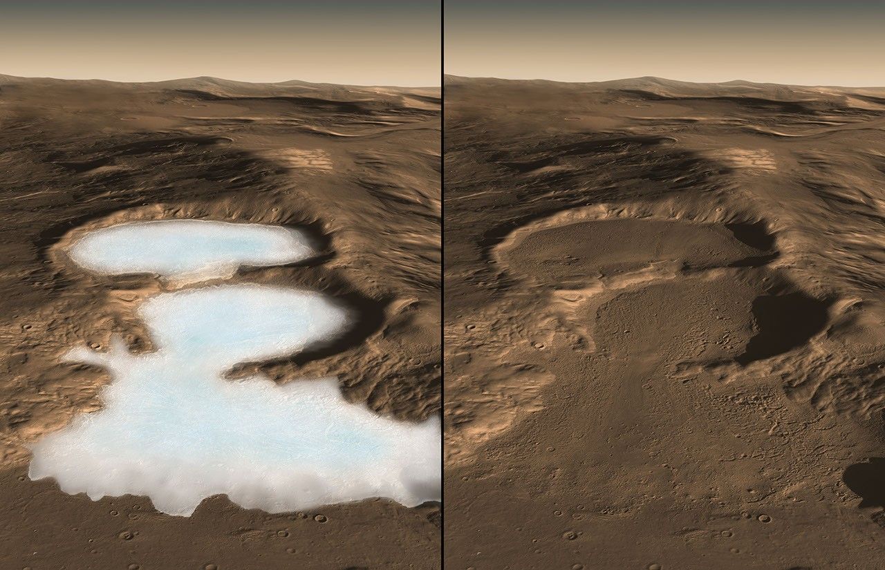 The movie begins with a view of how the surface looks today. A blue line is drawn on the image and an artist's concept then reveals what the ice may look like underneath. The movie was created using image data from the Context Camera on the Mars Reconnaissance Orbiter (MRO) spacecraft combined with results from the SHARAD radar sounder on MRO and HRSC digital elevation map from the Mars Express spacecraft. The color of the Martian surface and ice was estimated from MRO HiRISE color images of other Martian craters and the polar ice caps. The buried ice in these craters as measured by SHARAD is ~ 250 meter thick on the upper crater and ~ 300 and 450 meters on the middle and lower levels respectively. Each image is 20 km (12.8 mi.) across and extends to 50 km (32 mi) in the distance.