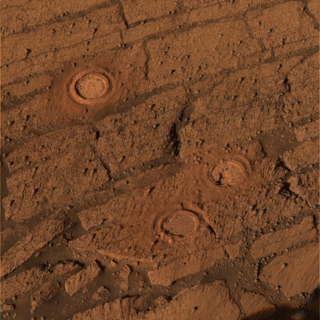 This image, from the panoramic camera, is an approximately true color rendering of the slope of "Endurance Crater," which NASA's Mars Exploration Rover Opportunity is currently exploring. Between sols 143 and 148 (June 18 to June 23, 2004), the rover's rock abrasion tool ground into three targets: "London" in the "D" layer (top) is 4.5 millimeters (0.18 inches) deep; "Virginia" in the "C" layer (middle) is 4.3 millimeters (0.17 inches) deep; and "Cobble Hill" in the "B" layer (bottom) is 3 millimeters (0.12 inches) deep. The shadow from the rover's camera mast is visible in the lower right corner of the image. This image was captured using the 601-, 535- and 482-nanometer filters.