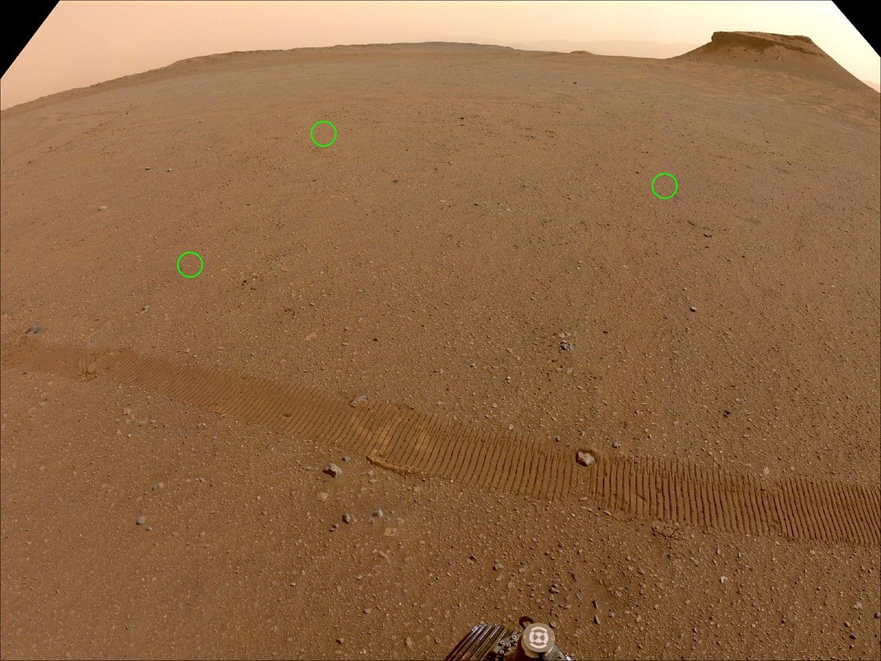 NASA's Perseverance Mars rover used one of its navigation cameras to take this image of the location where three of its 10 sample tubes will be deposited.