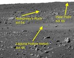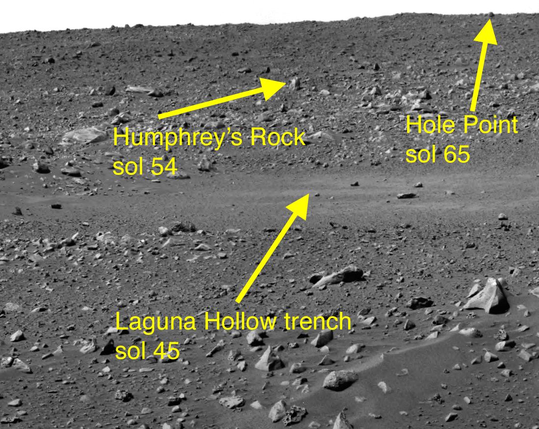 This image taken by the navigation camera on the Mars Exploration Rover Spirit shows the view ahead of the rover on the 44th martian day, or sol, if its mission. Directly in front of the rover is the shallow depression dubbed "Laguna Hollow," where it dug a trench with one of its wheels. Further in the distance and to the right is the rock nicknamed "Humphrey," and even further up and to the right is another rock called "Hole Point." These three features line the path the rover is taking to the large crater dubbed "Bonneville." Listed on the picture are the sols on which the rover reached each of these milestones.