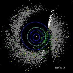 This movie shows the progression of NASA's Near-Earth Object Wide-field Survey Explorer (NEOWISE) investigation for the mission's first three years following its restart in December 2013. Green circles represent near-Earth objects (asteroids and comets that come within 1.3 astronomical units of the sun; one astronomical unit is Earth's distance from the sun). Yellow squares represent comets. Gray dots represent all other asteroids, which are mostly in the main asteroid belt between Mars and Jupiter. The orbits of Mercury, Venus, Earth and Mars are shown.