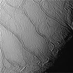This close-up view of Saturn's moon Enceladus looks toward the moon's terminator (the transition from day to night) and shows a distinctive pattern of continuous, ridged, slightly curved and roughly parallel faults within the moon's southern polar latitudes. These surface features have been informally referred to by imaging scientists as "tiger stripes" due to their distinctly stripe-like appearance when viewed in false color (see PIA06249).