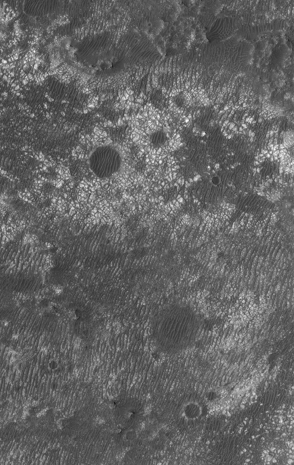 This Mars Global Surveyor (MGS) Mars Orbiter Camera (MOC) image shows a variety of materials found on the floor of an impact crater northwest of Hellas Planitia. The discontinuous, dark-toned ridges, typically running diagonally across the scene, are windblown ripples which overlie light-toned rock that is heavily fractured and cratered.