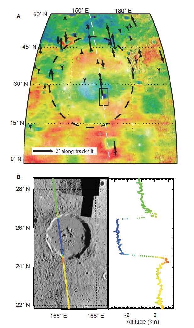 (Top) Average along-track tilts of the floors of impact craters (arrows) within and in the vicinity of Mercury's Caloris impact basin superimposed on regional topography. Tilts are obtained from representative MLA tracks across each crater. Arrow length is proportional to tilt. Dashed line shows the ground track of the profile at bottom, (Bottom) Profile MLASCIRDR1107292041 across the 100-km-diameter Atget crater demonstrates northward tilt of the crater floor.