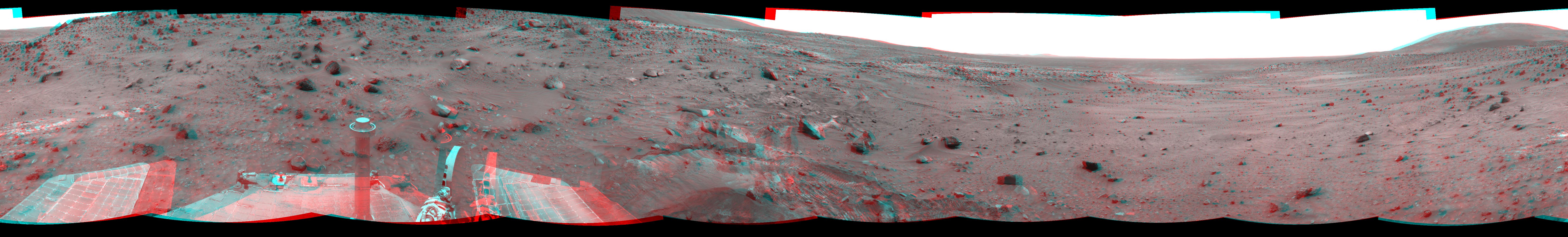 This view combines images from the left-eye and right-eye sides of the navigation camera. It appears three-dimensional when viewed through red-blue glasses with the red lens on the left.