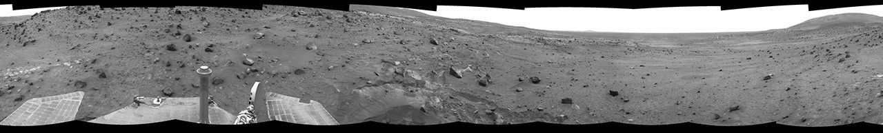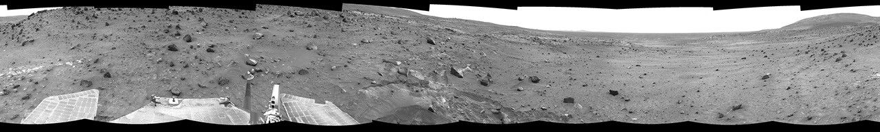 NASA's Mars Exploration Rover Spirit used its navigation camera to take the images that have been combined into this stereo, full-circle view of the rover's surroundings during the 1,843rd Martian day, or sol, of Spirit's surface mission (March 10, 2009). South is in the middle. North is at both ends.