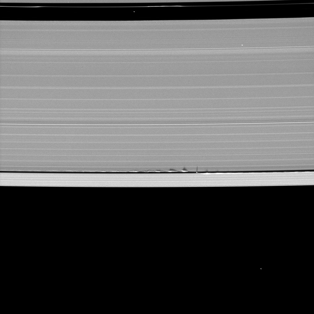 Measurements of the shadows in this and other images indicate that the vertical structures range between one-half to 1.5 kilometers tall (about one-third to one mile), making them as much as 150 times as high as the ring is thick. The main A, B and C rings are only about 10 meters (about 30 feet) thick. Daphnis itself can be seen casting a shadow onto the nearby ring.