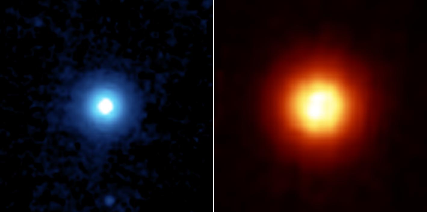 Both images show a very large, circular and smooth debris disc. The disc radius extends to at least 815 astronomical units. (One astronomical unit is the distance from Earth to the Sun, which is 150-million kilometers or 93-million miles).