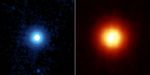 This side by side comparison, taken by Spitzer's multiband imaging photometer, shows the warm infrared glows from dust particles orbiting the star at wavelengths of 24 microns (figure 2 in blue) and 70 microns (figure 3 in red).